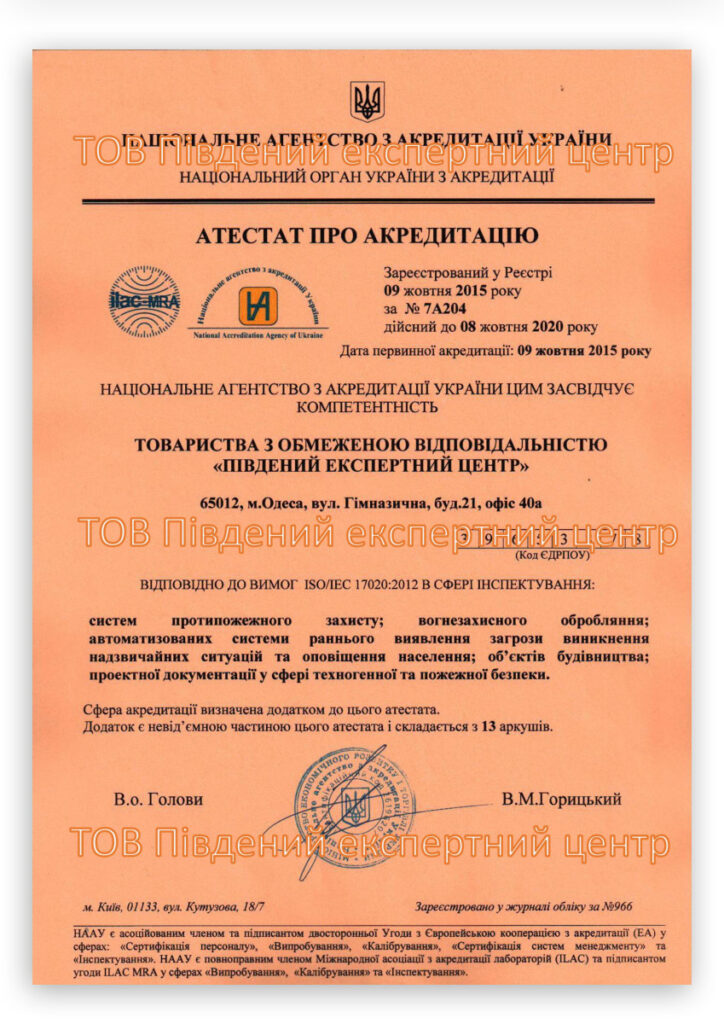 На сьогодні ми маємо відповідну акредитацію Національного агентства з акредитації України відповідно до Закону України «Про акредитацію органів з оцінки відповідності». Відповідно до Атестату акредитації, як орган з інспектування ми маємо право надавити послуги з інспектування систем протипожежної безпеки, вогнезахисного обробляння, автоматизованих систем раннього виявлення загрози виникнення надзвичайних ситуацій та оповіщення населення, об’єктів будівництва, проектної документації у сфері техногенної та пожежної безпеки, перевірки їх стану, надійності та безпечності, а також відповідності національним та міжнародним стандартам. Всі наші спеціалісти сертифіковані експерти, мають необхідний освітній рівень та досвід роботи, що дає змогу здійснити високо кваліфіковане та об’єктивне інспектування або консультування з питань пожежної та техногенної безпеки, оцінки проектної документації, перевірки відповідності систем протипожежного захисту на об’єктах, що готуються до введення в експлуатацію або вже перебувають в експлуатуванні.